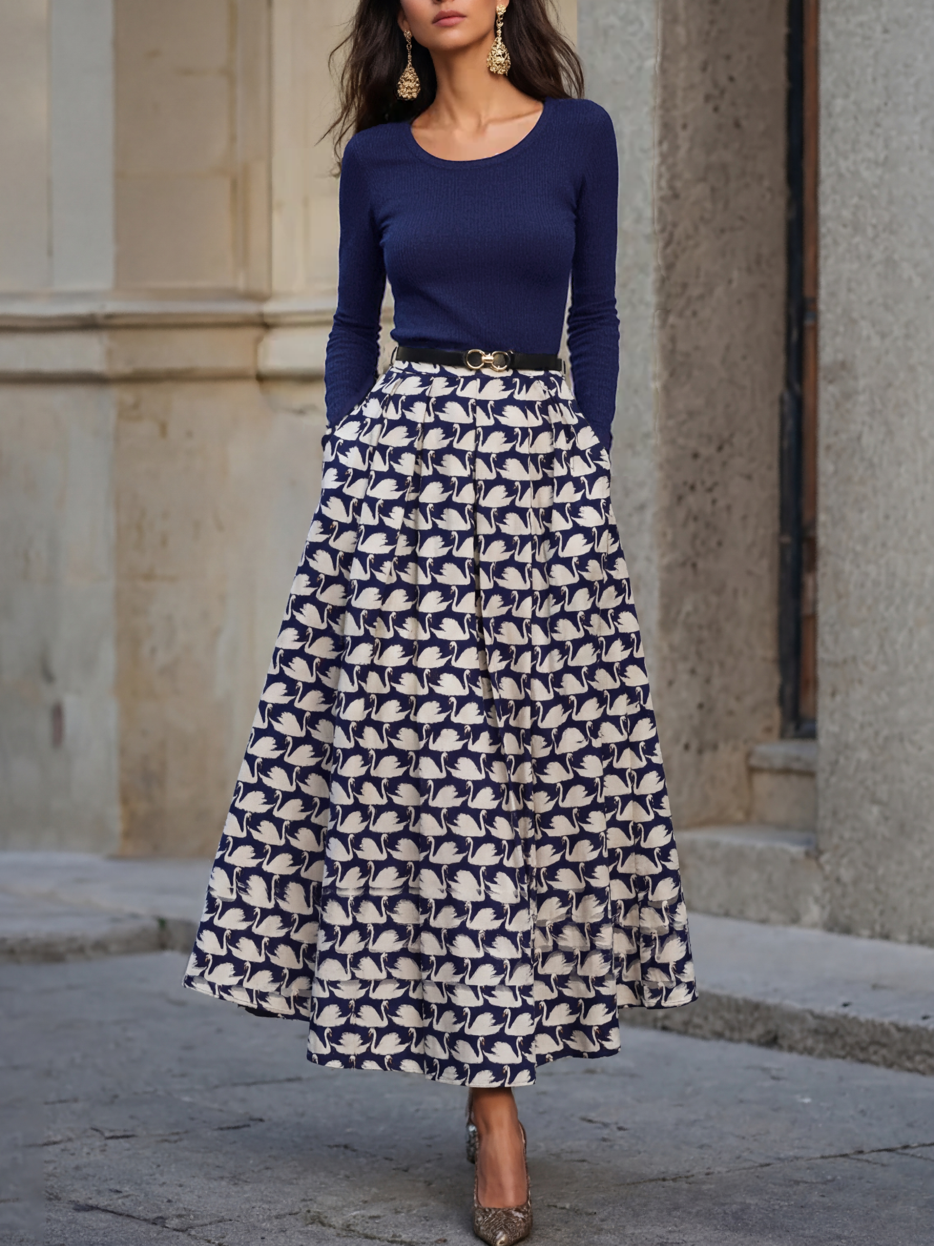 Linen-Cotton Blend Knit, Long Sleeves, Round Neck, Plain, Purplish Blue