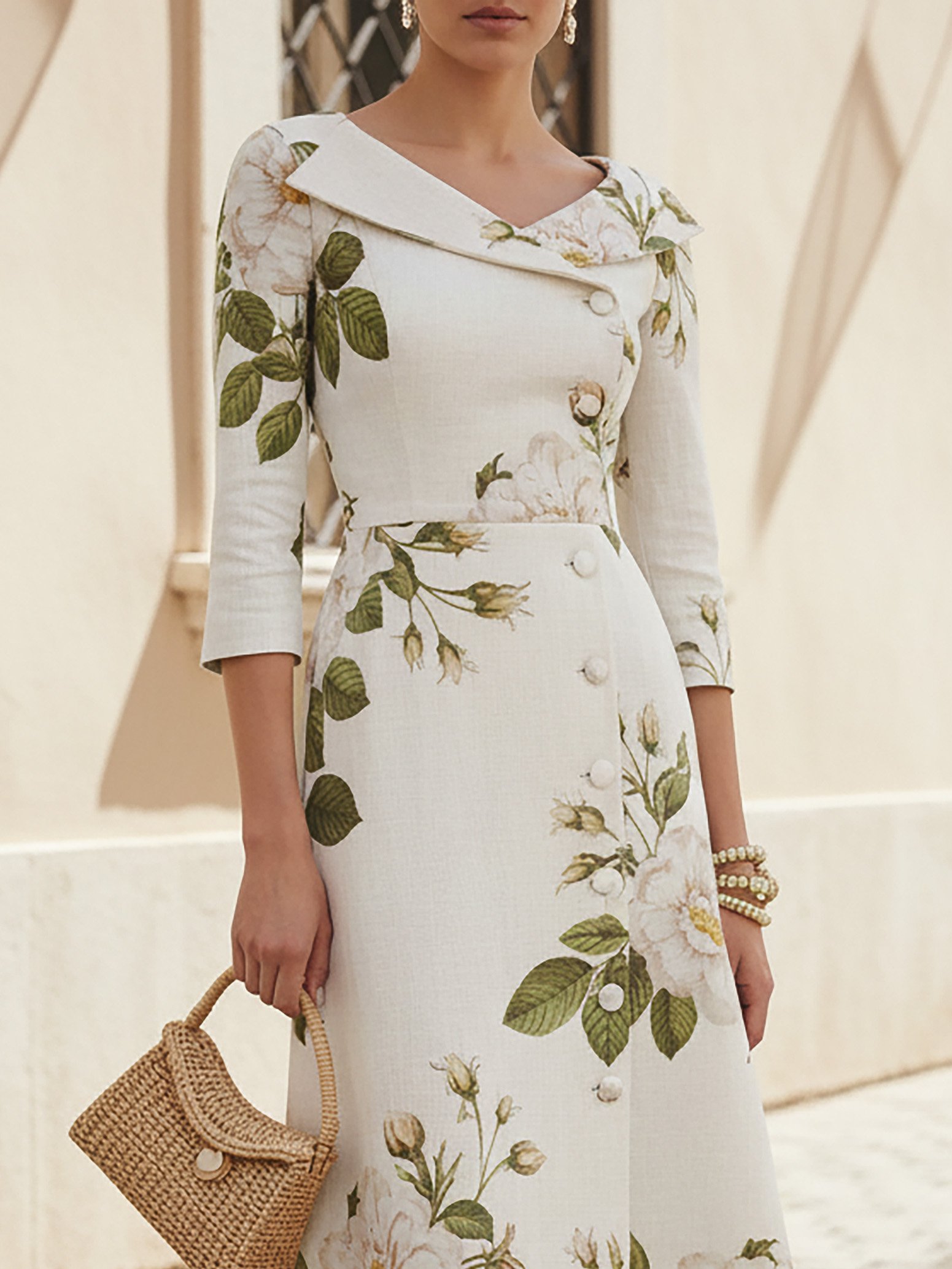 Midi Linen Dress, Half Sleeve, Shawl Collar, Floral, Button Design, Vintage, White