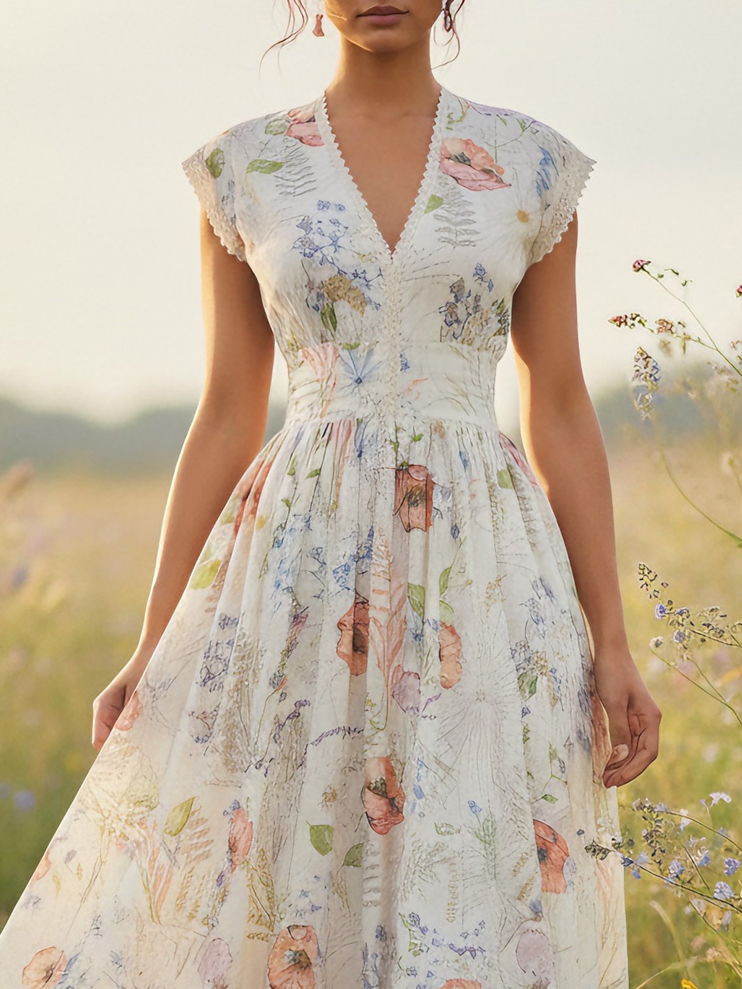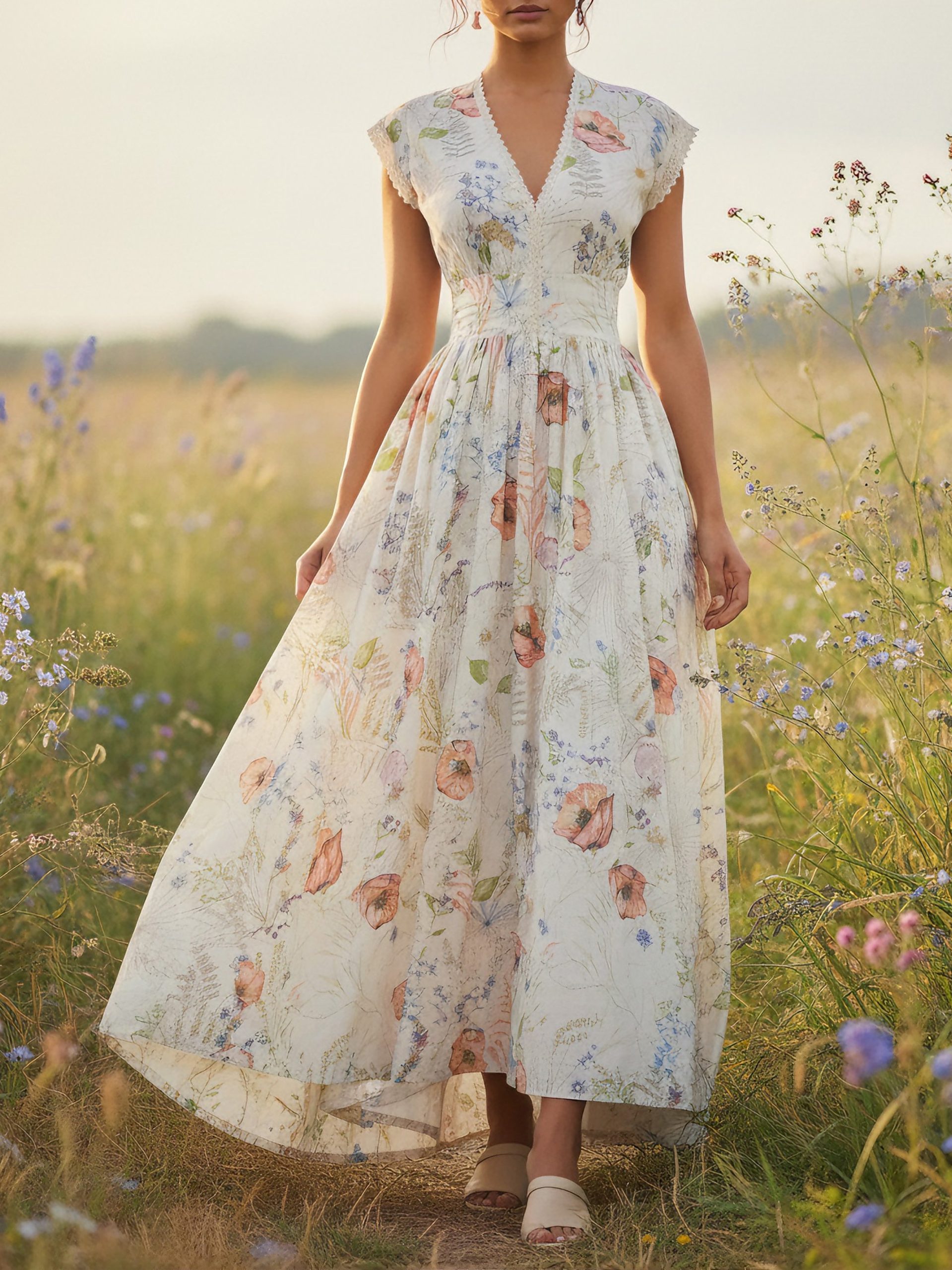 Maxi Cotton Dress, Cap Sleeves, V Neck, Floral, Lace, Vintage, Red