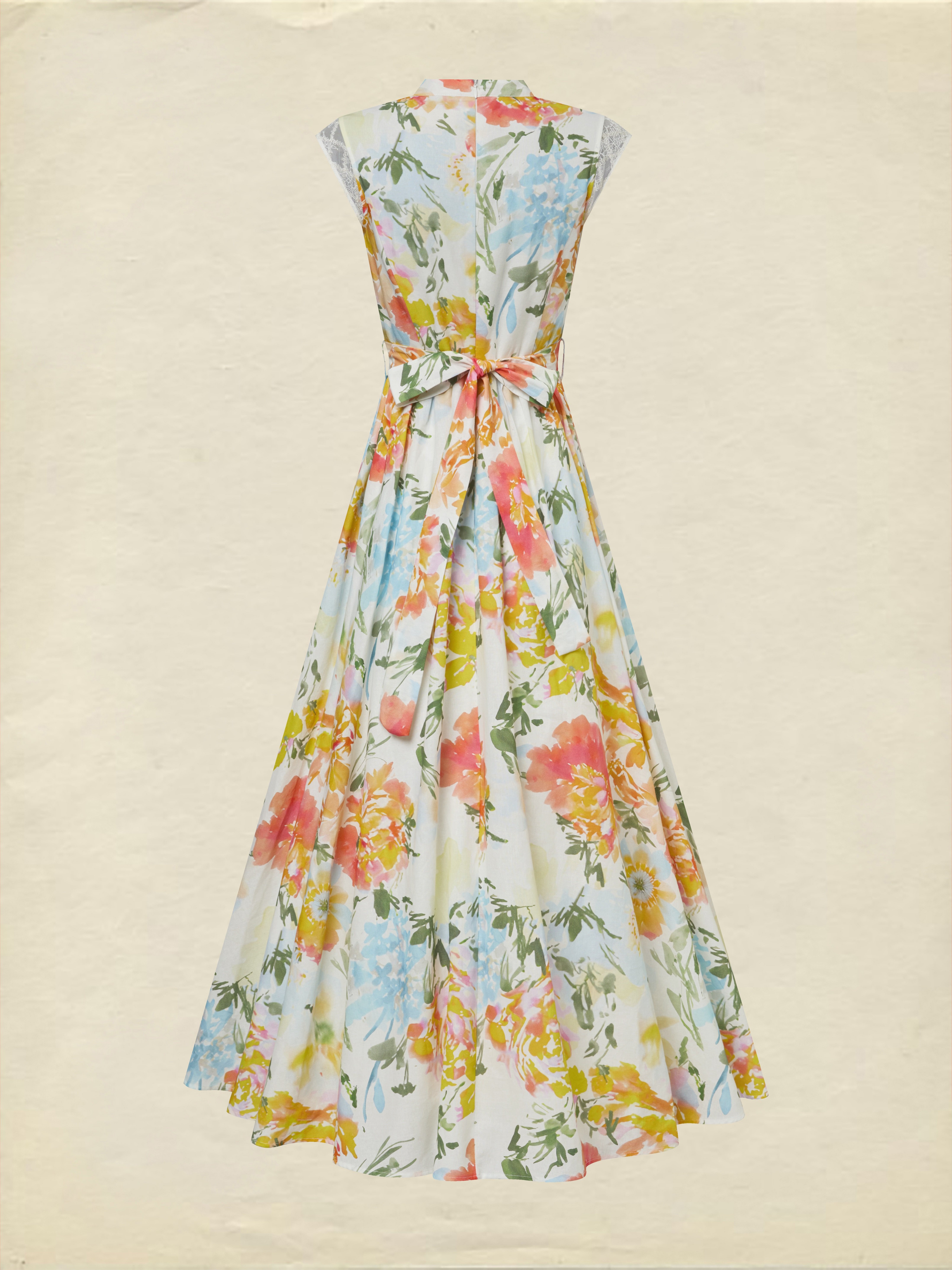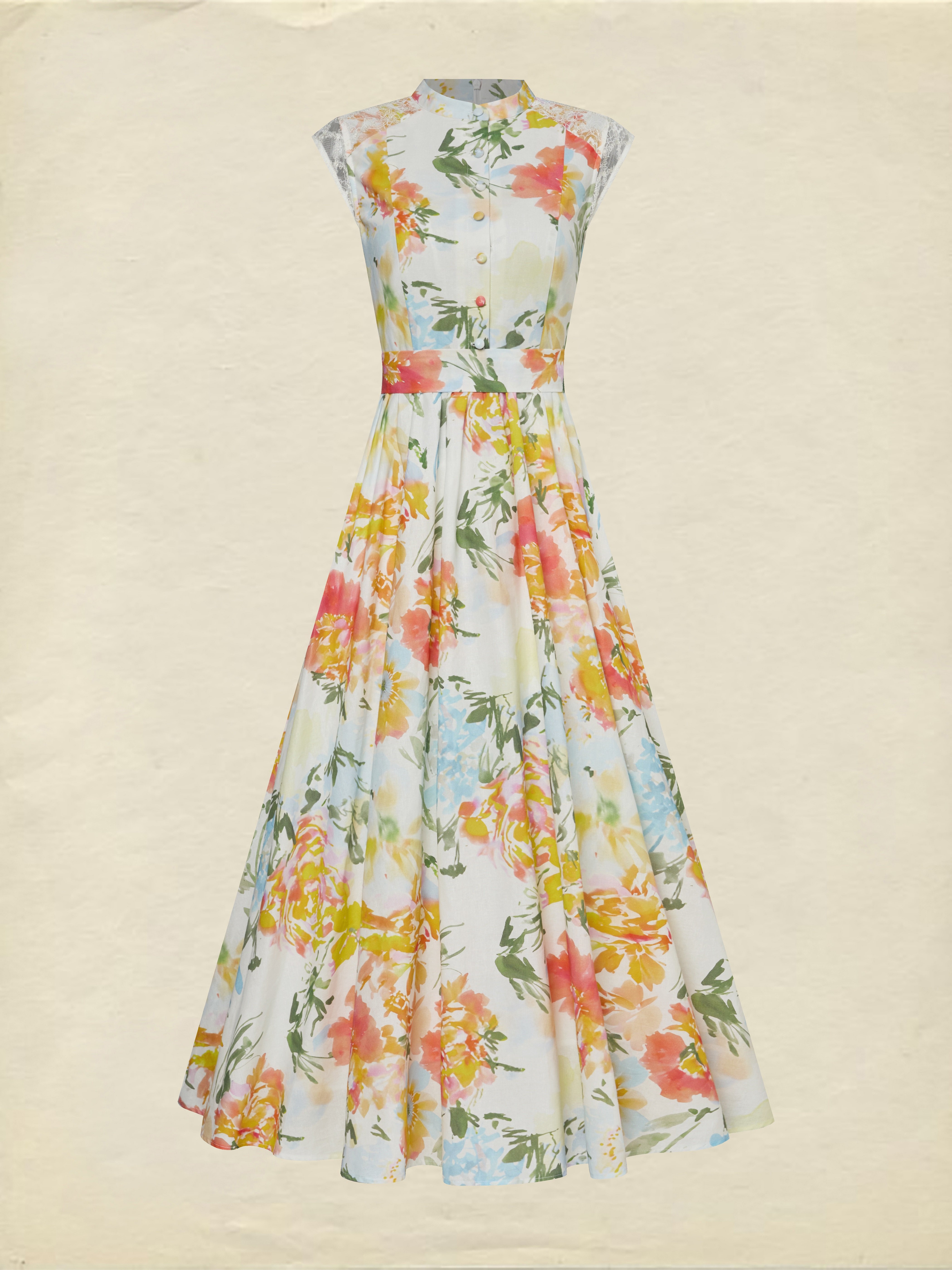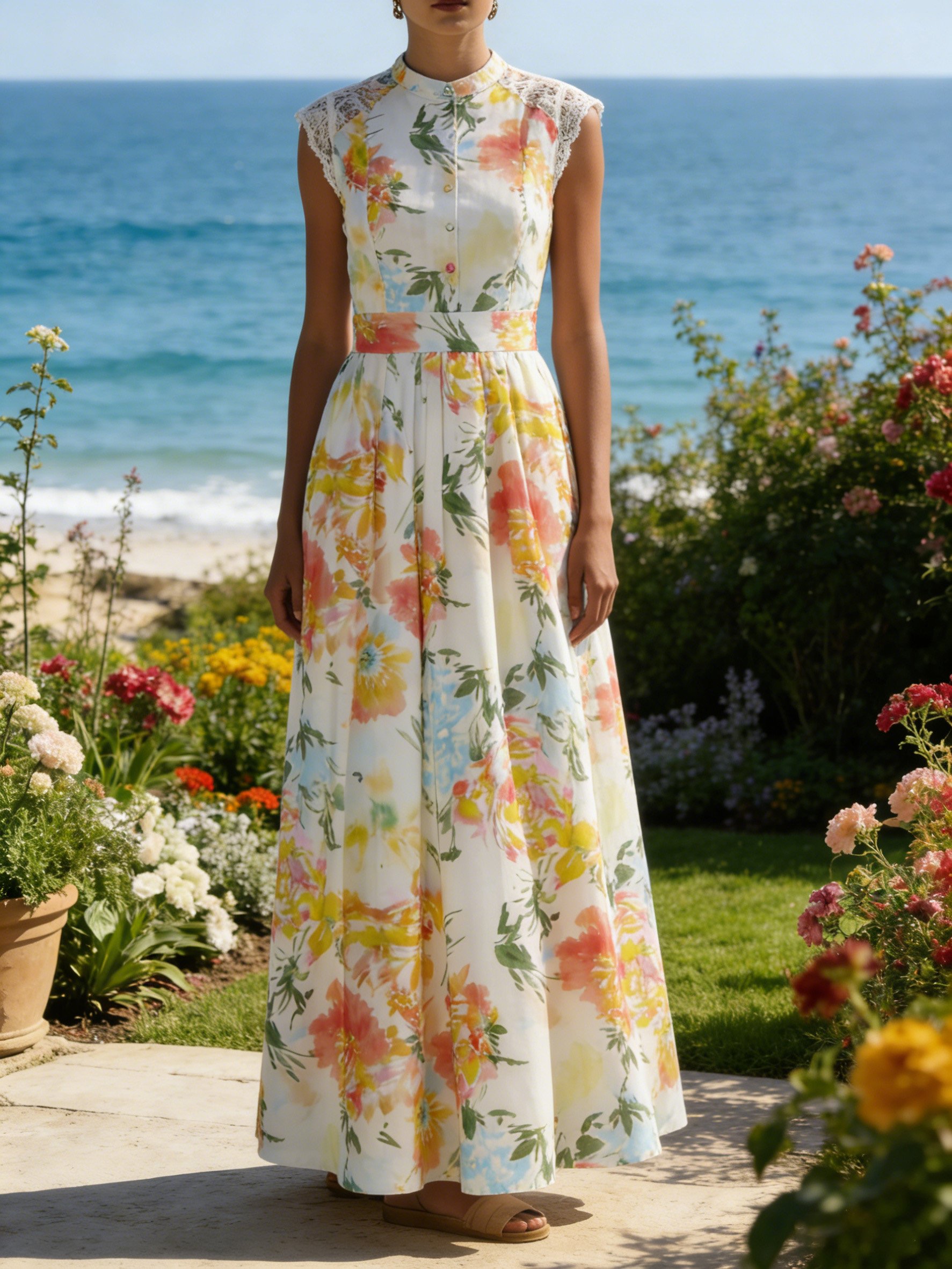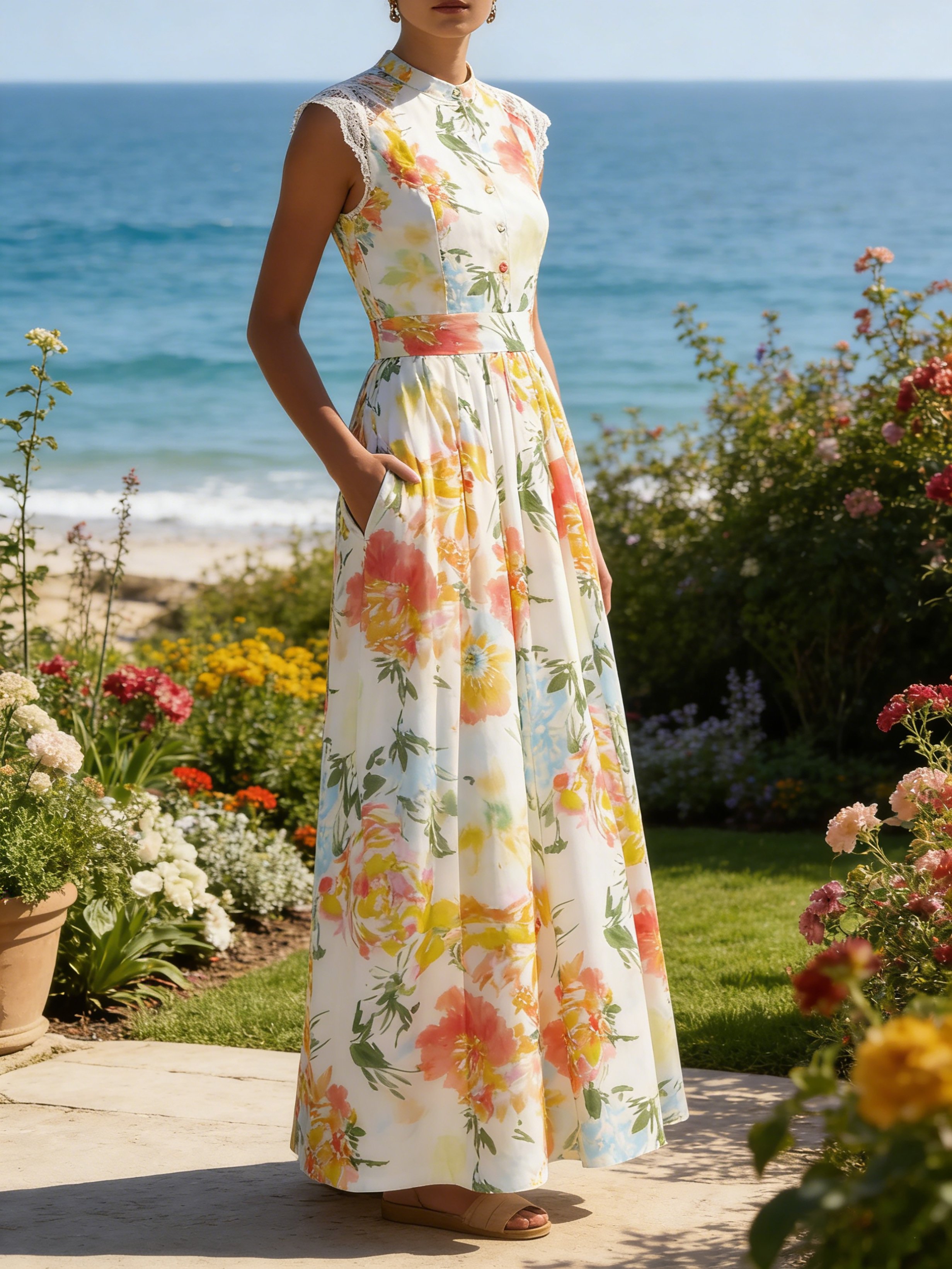 Maxi Cotton Dress, Sleeveless, V Neck, Plain, Lace, Vintage, White